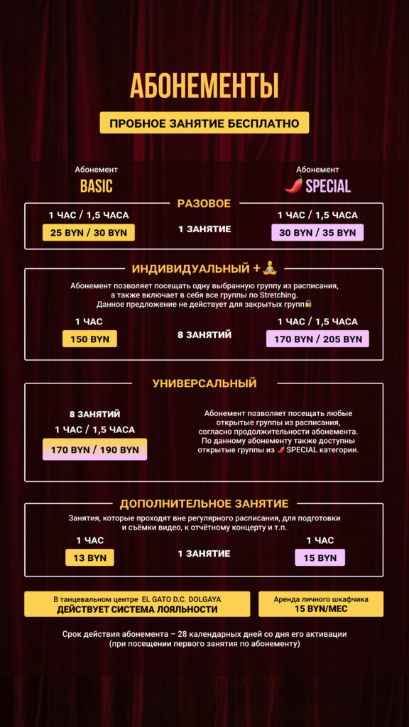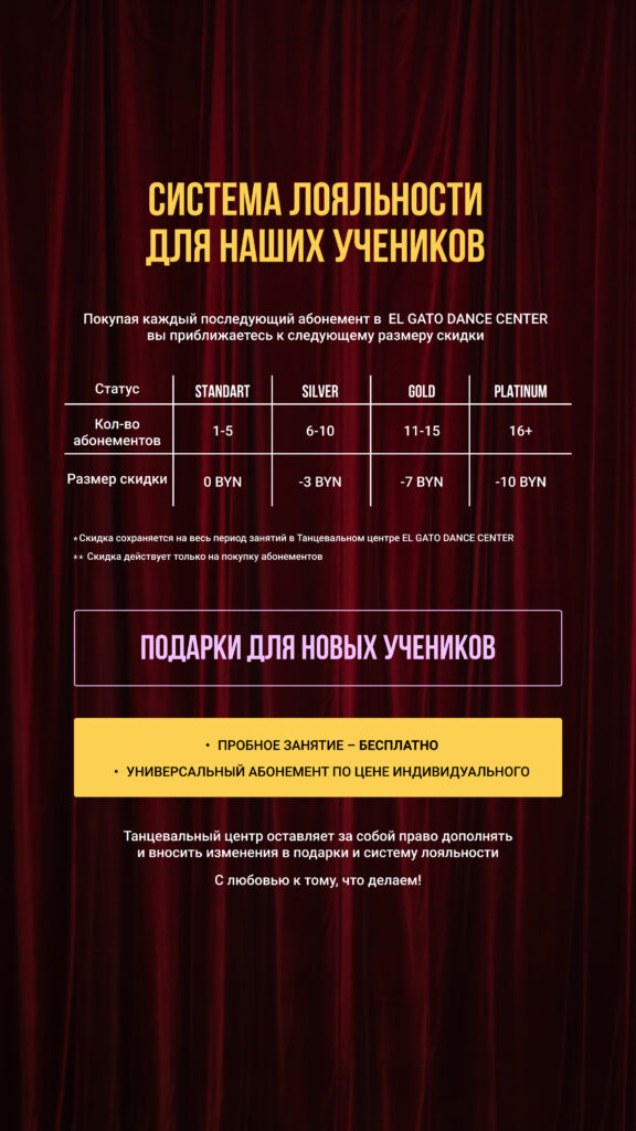 Рекомендуем ознакомиться с Правилами пользования личной картой/абонементами, а также с Правилами посещения Танцевального центра и условиями возврата и отказа от услуг. Подробнее