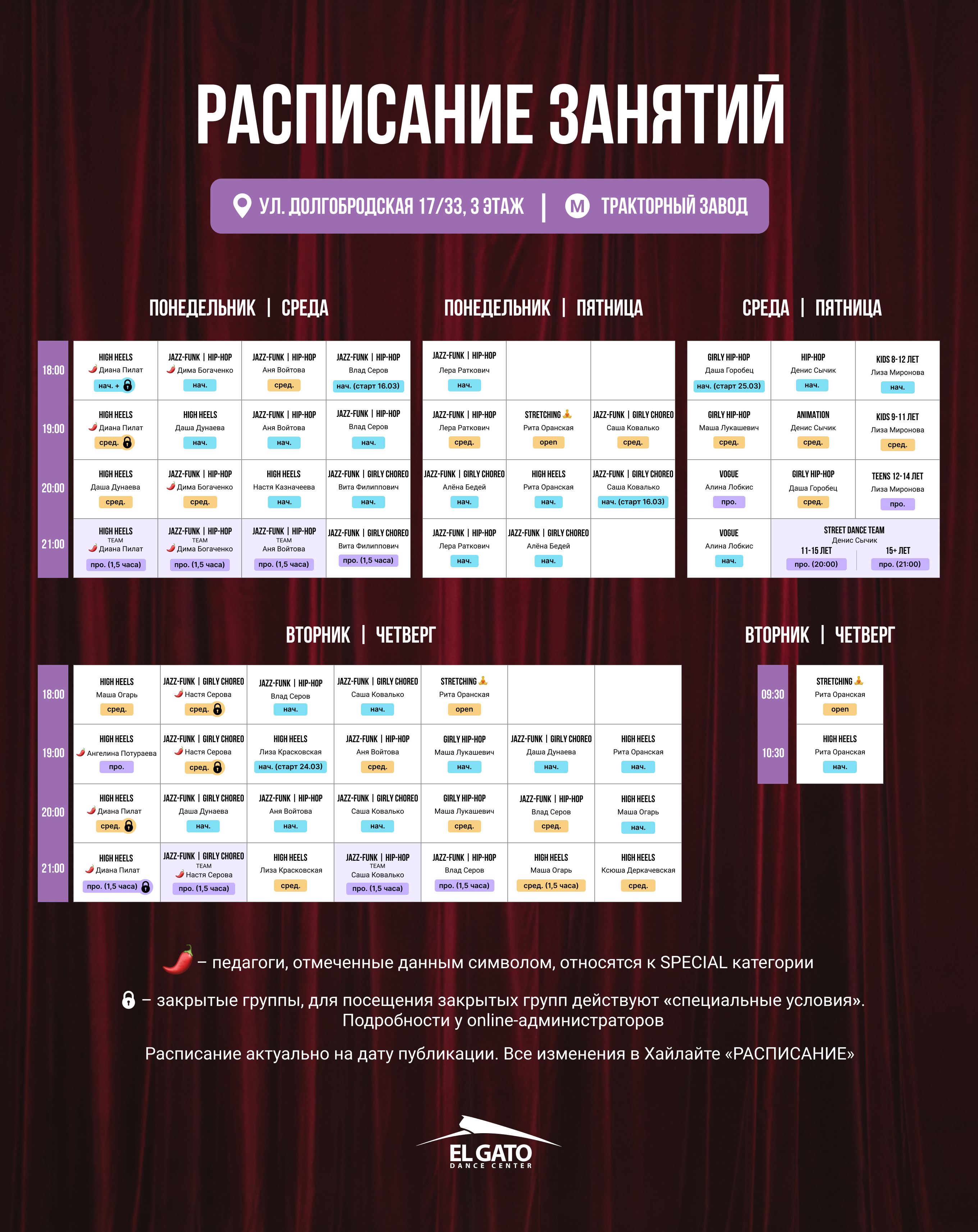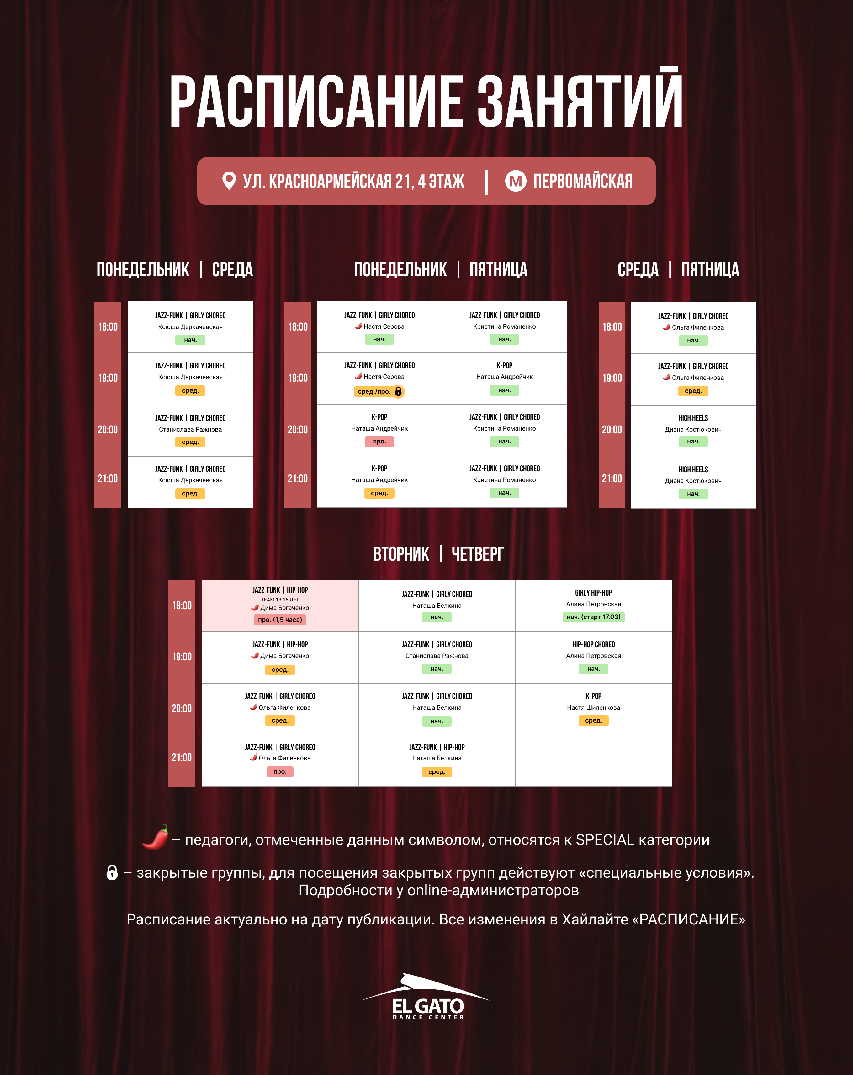 Педагогический состав Танцевального Центра - профессионалы своего дела! За плечами педагогов EL GATO DANCE CENTER многолетний преподавательский опыт, сотни посещенных мастер-классов и обучений за рубежом, множество организованных танцевальных ивентов, судейство и участие в значимых чемпионатах и фестивалях Беларуси и зарубежья.